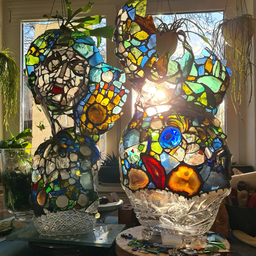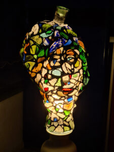 Diesen beiden Unfertigen ist jetzt schon anzusehen, dass sie u. a. aus Lust an der Transparenz und des farbigen Spiels, welches das einfallende Licht mit ihnen treibt, entstanden sind. Auch wir Menschen bestehen ja aus vielen kleinen Bausteinen, die unserem Leben seine Richtung geben und auch wir leuchten von innen heraus. Manche mehr, andere weniger, immer entsprechend der Facetten, die einer besitzt, denn diese machen unseren Charakter aus. Das Thema „LIEBE“ in Glasbauweise zu bearbeiten, ergab sich für mich in mehreren Schritten, die der eigentlichen Arbeit vorausgegangen sind. Dabei bin ich dann mit den unterschiedlichsten Sorten von Scherben experimentierend, an mir gewachsen. Bevor ich mich daran wagte, Portraits aus Glas zu bauen, sind zuerst verschiedene Windlichter zu Versuchszwecken entstanden, kleine und größere – und erst später puzzelte ich dann einen Lampenschirm zusammen, mit Gesicht und mit einer leuchtfähigen Glühbirne im Inneren.
