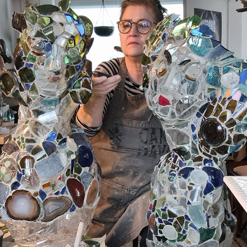 Der Aufbau ist langwierig und mühsam, es wackelt, ehe alles sich verbindet und ich brauche deshalb enorm viel Geduld. Trotzdem kann ich nicht davon lassen. Die Scherbenstücke halten sich gut aneinander fest, verzahnen sich sozusagen ein bißchen und dann steht die Arbeit irgendwann. Anders als die „echten“ Glasgestalter, die mit vorab gemachten Entwürfen hantieren, weil sie das müssen und es von ihnen erwartet wird, darf ich mir die Freiheit erlauben, darauf zu verzichten. Ich liebe es unberechenbar, großzügig und impulsiv – ohne übermäßige Kontrolle zu sein. Mir reicht eine kleine Ideenskizze. Und so liegt meiner Arbeit nur ein grober Plan zugrunde an dem entlang, ich mich Stück für Stück geduldig hangele und dessen spontane Realisierung und nicht zuletzt auch die Wirkung (meist besser noch als gedacht), die Künstlerin erfreuen.
